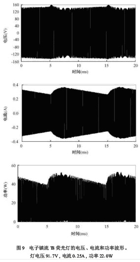 金鹵燈的瞬時(shí)電壓、電流和功率如圖10、圖11所示。由于金鹵燈是氣體原子(或分子)直接發(fā)光,光子弛豫時(shí)間只有~1μs,遠(yuǎn)小于50Hz下功率的過零時(shí)間 (~2 ms),所以電感鎮(zhèn)流時(shí)光波動深度高達(dá)50%。金鹵燈電子鎮(zhèn)流器的頻率為140Hz,輸出電壓為方波,所以燈電壓也接近方波,功率過零時(shí)間<10μs,這樣電子鎮(zhèn)流時(shí)金鹵燈的光波動就很小對HID燈,只要帶電粒子濃度的過零時(shí)間比燈功率過零時(shí)間長,光波動就會較小。