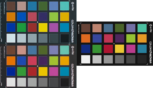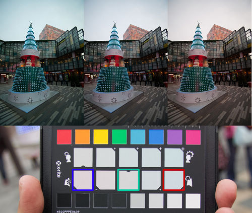 DNG配置文件的實際效果如何?色卡本身的照片非常具有說服力,下圖1、2、3是同一張RAW輸出的不同結(jié)果,左上方是Lightroom里的默認輸出,左下方則是套用根據(jù)這張照片制作的DNG配置文件后的結(jié)果,右側(cè)是作為對比的標準色卡電子文件。很明顯,矯正后的各個色塊更貼近實際應有的色彩表現(xiàn)。