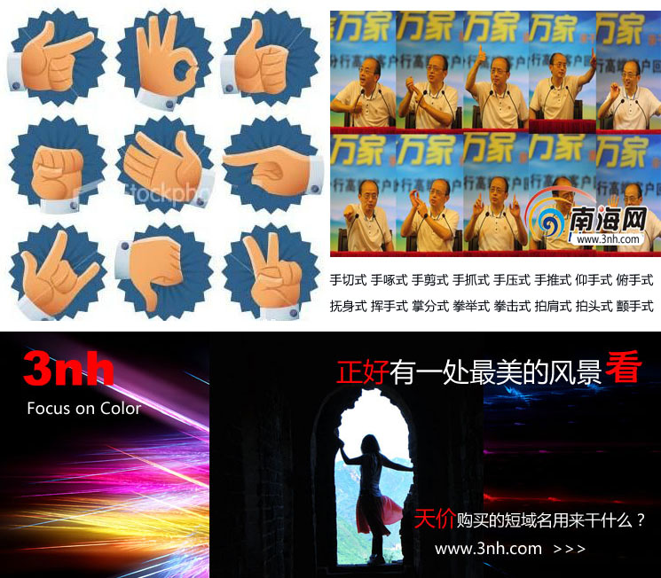 拇指食指并用式。拇指,食指分開伸出,其余三指彎曲表示8、80、800……如果并攏表示肯定,贊賞之意,如果二者彎曲靠攏但未接觸,則表示“微小”“精細(xì)”之意。 拇指,食指,中指并用式,三指相捏向前表示“這”“這些”。用力點(diǎn)表示強(qiáng)調(diào),也表示數(shù)字7、70、700……