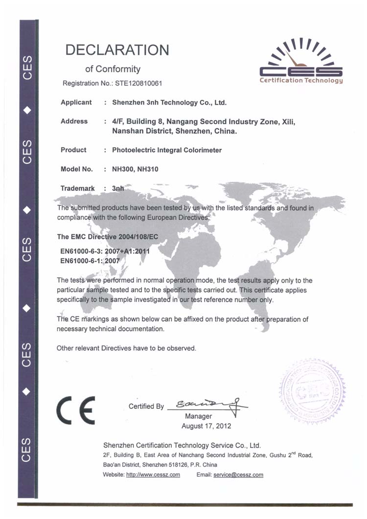 3nh全系列色差儀通過CE認(rèn)證