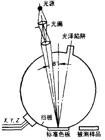 色差儀的光學(xué)結(jié)構(gòu)相對較為簡單,圖1為8/d照明方式的光學(xué)結(jié)構(gòu),包括了光源、進入積分球前的光路、積分球、感應(yīng)器。其他照明方式的光學(xué)結(jié)構(gòu)也與此相差不大。