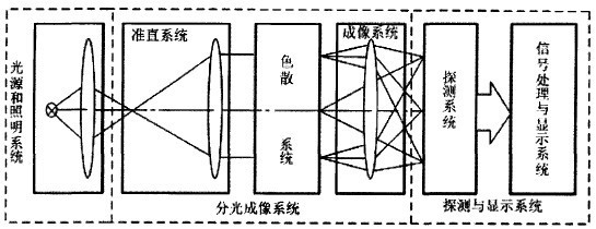 分光測試儀的光學(xué)結(jié)構(gòu)相對較為復(fù)雜,圖2為分光測色儀的光學(xué)原理結(jié)構(gòu)圖,包括了光源、照明系統(tǒng)、準(zhǔn)直系統(tǒng)、色散系統(tǒng)、成像系統(tǒng)和感應(yīng)探測系統(tǒng)。