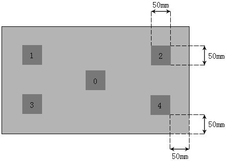 對(duì)同一片玻璃在其4個(gè)角和正中間分別切取50mm×50mm的樣品5小塊,試樣外邊緣距玻璃邊緣為50mm,以中間樣品編號(hào)為0號(hào),其余4個(gè)角樣品編號(hào)分別為1、2、3、4號(hào),如圖1所示。