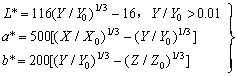 鍍膜玻璃色差的檢測(cè)通過(guò)CIE1976推薦的在視覺(jué)上近似均勻的L*a*b表色空間和色差公式進(jìn)行,該色空間表示顏色的三個(gè)參數(shù)為米制明度L* 和另一種米制色度a*和b*。三個(gè)參數(shù)的定義式如下