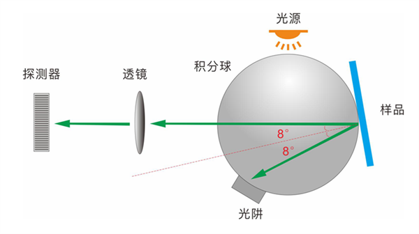 積分球作為光學(xué)擴散器來減小測量誤差,得到更加精確的測量結(jié)果。一般情況下,光學(xué)擴散片的適當(dāng)使用下,可以降低測量時因為探測器上的入射光不均勻分布或者光束偏移造成的誤差,這樣可以提高色差儀在測量時的精準(zhǔn)性。