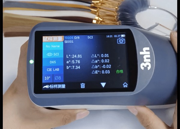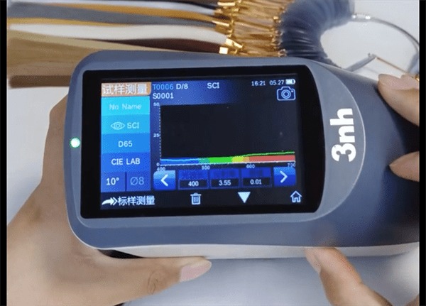 3. 標(biāo)樣測(cè)量。選取好一塊假發(fā)的某個(gè)位置,YS6010分光測(cè)色儀測(cè)量口緊貼假發(fā)表面,輕觸測(cè)量鍵進(jìn)行測(cè)量。測(cè)量后測(cè)試屏幕會(huì)顯示相應(yīng)顏色數(shù)據(jù)。
