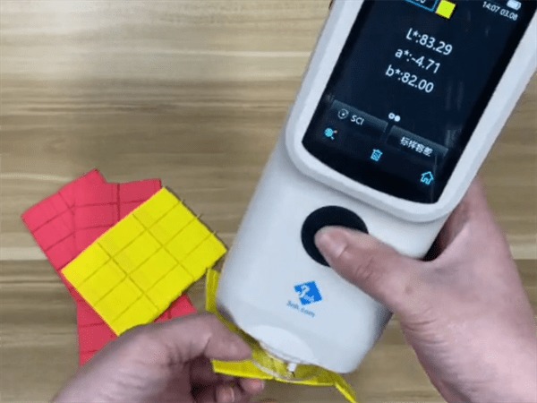 將色差寶緊貼在硅膠樣品表面,輕觸測量鍵,即可完成測量。再次需要注意:硅膠樣品表面需干凈整潔,不能有任何臟污劃痕等,否則會影響測量結果的準確性。