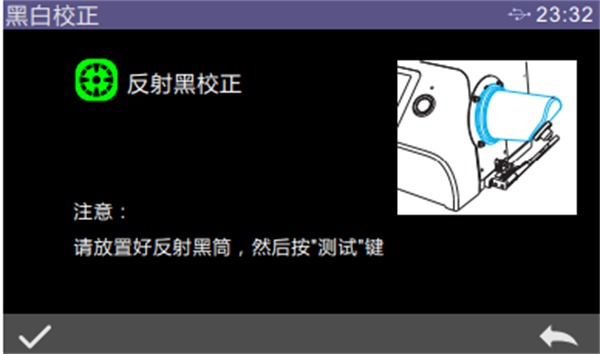 在主菜單界面點擊“黑白校正”進入黑白校正界面。在界面中會顯示目前校正是否有效以及校正有效剩余時間。點擊“→”,進入反射黑校界面,根據(jù)提示放好黑筒,然后按測量鍵進行黑筒校正?;蛘甙础啊比∠⑼顺鲂U?/font>