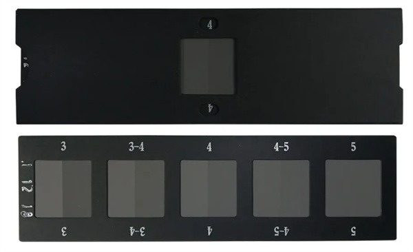 變色用灰色樣卡由五對(duì)無光的灰色紙片(或布片)組成,下圖為根據(jù)可辨的色差分為五個(gè)牢度等級(jí),即5、4、3、2、1。在兩個(gè)等級(jí)中間再補(bǔ)充半級(jí),即4-5、3-4、2-3、1-2,就擴(kuò)大成為五級(jí)九擋灰卡。每對(duì)第一組成均是中性灰色,其中色牢度等級(jí)5的第二組成與第一組成相一致,其他各對(duì)的第二組成依次變淺,色差逐級(jí)增大,各級(jí)觀感色差均經(jīng)過色度確定。