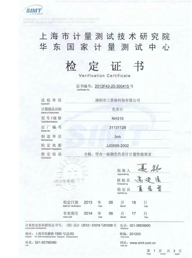 為了觀察得更為直觀,可以參看一級色差儀計量證書,示例:nr110。
