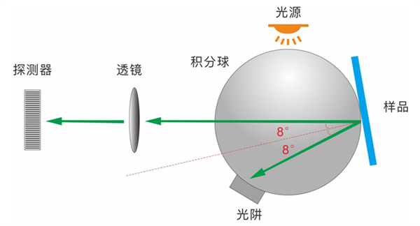 當(dāng)光線進(jìn)入積分球后,會在球壁上多次反射,然后從測量孔或光源孔射出積分球。一束光從任意的不通過球心的角度照進(jìn)積分球,經(jīng)過球壁的多次反射后,會從各個角度照射到樣板,最終通過測量孔或光源射出積分球。測量孔是在與法線夾角成8°的位置,由一組光電管構(gòu)成的探測器。