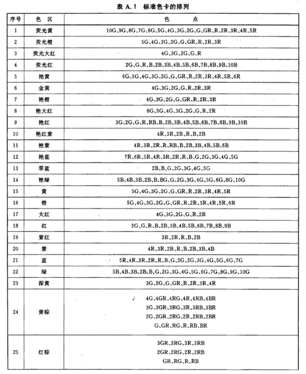 本標準色卡乙種本與甲種本比較以及復(fù)制時色光的許可誤差為:按GB 250-1995進行評定時不低于4~5級。