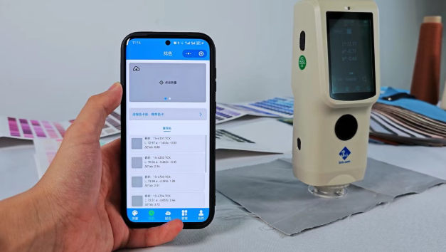 現(xiàn)在可好了!用上 CR8 分光測色儀加配色云小程序,羅紋布找色直接 “扔了” 色卡本!客戶給塊樣布,往 CR8 上一放,按個鍵,數(shù)據(jù)立馬傳到小程序里,不用咱手動對,小程序直接一鍵匹配最準(zhǔn)的色號,快得很!