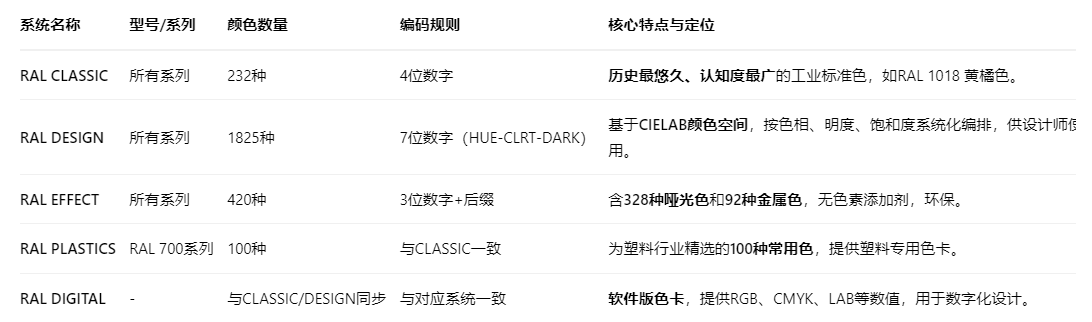 勞爾色卡經(jīng)過(guò)近百年的發(fā)展,形成了多個(gè)針對(duì)不同需求的色彩系統(tǒng)。每個(gè)系統(tǒng)都包含獨(dú)特的顏色范圍和編碼規(guī)則,以滿足從傳統(tǒng)工業(yè)到現(xiàn)代設(shè)計(jì)的多樣化需求。