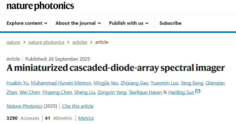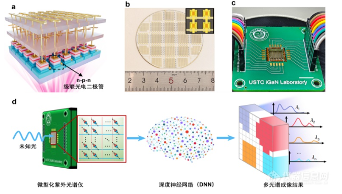 中國科學(xué)技術(shù)大學(xué)教授孫海定聯(lián)合中國科學(xué)院院士、武漢大學(xué)教授劉勝團(tuán)隊(duì),成功研制出微型紫外光譜儀,實(shí)現(xiàn)片上光譜成像。該光譜成像儀基于新型氮化鎵基級聯(lián)光電二極管架構(gòu),并與深度神經(jīng)網(wǎng)絡(luò)算法融合,實(shí)現(xiàn)了高精度光譜探測與高分辨率多光譜成像,其光譜響應(yīng)速度達(dá)到超快納秒級。日前,相關(guān)成果在線發(fā)表于《自然-光子學(xué)》。