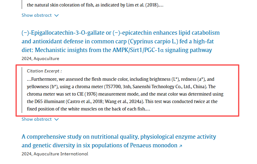 而在這場(chǎng)"精準(zhǔn)診斷"中,一個(gè)"科學(xué)工具"功不可沒——三恩時(shí)TS7700分光測(cè)色儀??赡苡腥藭?huì)問:研究肉質(zhì)為什么要測(cè)顏色?其實(shí),魚的顏色與品質(zhì)密切相關(guān)。比如黃河鯉的黃色,主要來自類胡蘿卜素,這種物質(zhì)不僅影響外觀,還與肉質(zhì)風(fēng)味、營(yíng)養(yǎng)價(jià)值直接相關(guān)。但人眼判斷顏色主觀且不準(zhǔn),而分光測(cè)色儀能將顏色轉(zhuǎn)化為精確的數(shù)字?jǐn)?shù)據(jù),讓野生與養(yǎng)殖鯉魚的色澤差異"看得見、算得清",為研究提供了客觀依據(jù)。