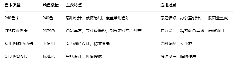 240色卡作為最普及的版本,采用扇形設(shè)計,包含從中性基礎(chǔ)色到流行色的全面選擇,足以滿足大多數(shù)家庭裝修需求。