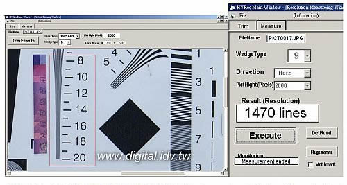 HYRes 3.1運作原理依據(jù) MTF,而非SFR;程式介面分成切割區(qū)(Trim)與測量區(qū)(Measure)兩大部分,使用時須切割下解像力尺(如紅框),電腦會自動檢查尺上的臨界點,再經(jīng)由換算得出解像力線數(shù)。程式和運作都非常簡單,符合日式風范,不過,這種作法也有極限存在,本站推出 2005年年鑒第62頁 - Canon 1Ds MKII 因其解像力本身已經(jīng)超過 ISO12233 的臨界點所以無法導(dǎo)出結(jié)果。