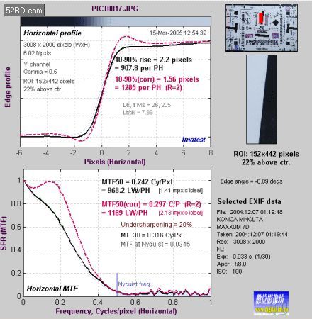 另一張圖則是顯示 MTF/SFR 主要數(shù)據(jù),這部分與 Edge profile 相同,黑色實線為原始數(shù)據(jù);紅色虛線則代表移除(或加上)數(shù)字相機內(nèi)建銳利化效果的表現(xiàn)。 Imatest 會將原始 MTF 影像降低 50%的明亮度,來計算SFR,這樣的做法可以繼保留影像細節(jié)又不會被測試圖上的雜點所干擾,標示為 MTF50 以玆區(qū)別 。Imatest 會將計算出來的SFR值轉(zhuǎn)換成 LW/PH ( line widths per picture height ) 1個 LW/PH = 2 *line pairs per millimeter (lp/mm),供使用者判斷影像品質(zhì)。