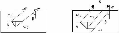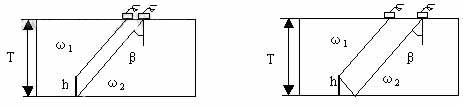 對于有傾角的裂紋,如下圖,若上端點(diǎn)和下端點(diǎn)由一次波探測到(左圖),一次波聲程分別為ω1和ω2,則其垂直高度h為