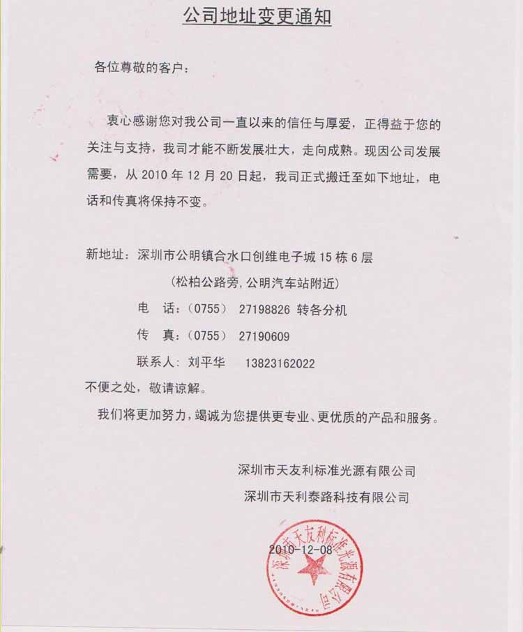 深圳市天友利標(biāo)準(zhǔn)光源有限公司地址變更通知
