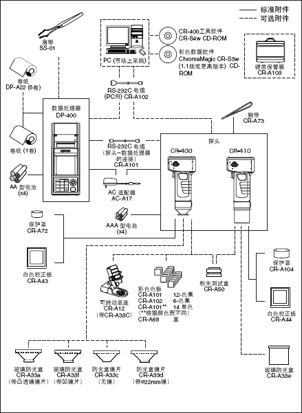 硬盒CR-A103、RS-232C線纜CR-A102(連接PC)、粉體單元CR-A50、CR-400實(shí)用軟件CR-S4w、色彩管理軟件SpectraMagic NX CM-S100w、帶玻璃罩的遮光筒CR-A33e |