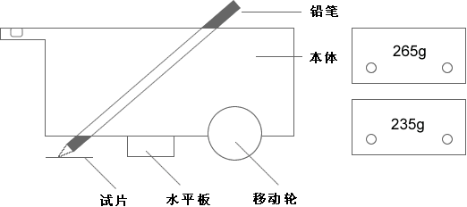 先將試片和儀器置於測(cè)試平臺(tái)上,選擇硬度適當(dāng)?shù)你U筆,削除鉛筆木質(zhì)部分,使筆芯露出約3mm長將鉛筆芯在砂紙上成45度角研磨平,使鉛筆前端面平坦邊角銳利,此時(shí)即可將鉛筆插入45度孔內(nèi)(水平板平放機(jī)臺(tái)下確保水平),使筆尖著落于試片前端,再用本體側(cè)面螺絲鎖定鉛筆.然后用手推動(dòng)儀器平行移動(dòng)約3-6㎝(推速約1.0㎝/s),取下試片將筆尖犁痕擦試干凈.若目視無刮傷痕跡,則再選擇硬一級(jí)鉛筆(若有刮痕,則選擇軟一級(jí)鉛筆),再試之,依次類推.