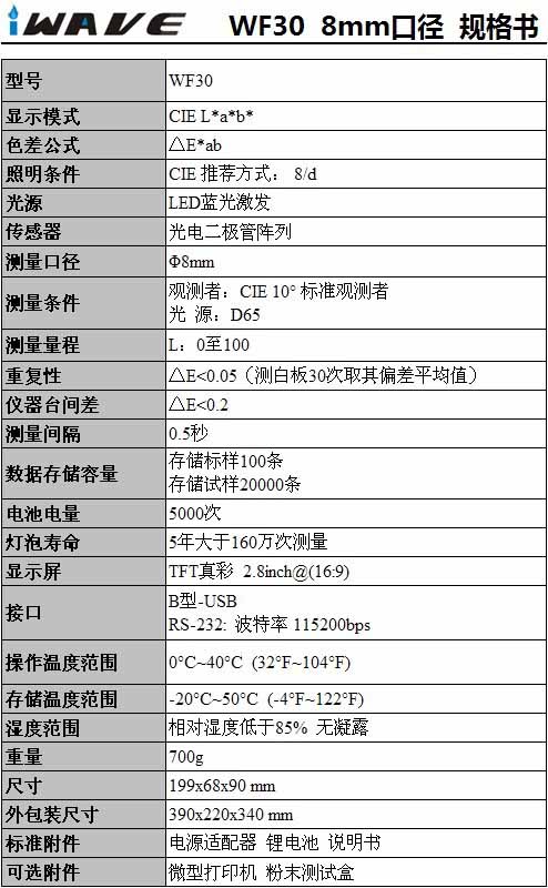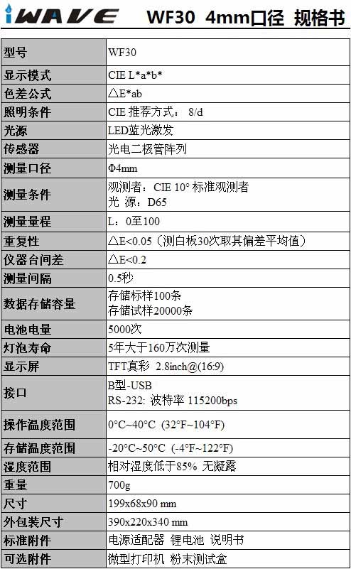 WF30 WF28 WF32精密色差儀8mm口徑或4mm口徑(二選一)版本是一款通用型色差儀,綜合考慮了各行各業(yè)檢測顏色的通用方法及適用習(xí)慣,并考慮了多種材質(zhì)在測量時對測量口徑大小的要求而開發(fā)研制的。WF30精密色差儀8mm口徑或4mm版本因其通用性及其本身極小的臺間差、測量穩(wěn)定性,為各行各業(yè)進行本行業(yè)、跨行業(yè)的顏色交流提供了極大的方便性和可信賴的可靠性。