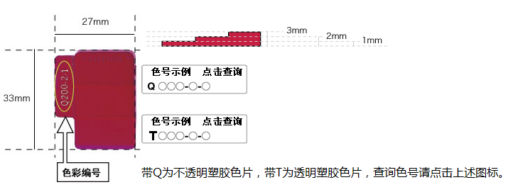 每塊選色片的尺寸為27mm X 33mm(1.1"x1.3"),三種厚度為1、2及3mm(0.04、0.08和0.12英寸)。