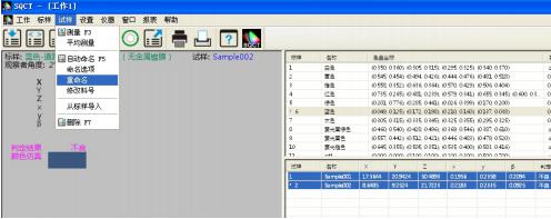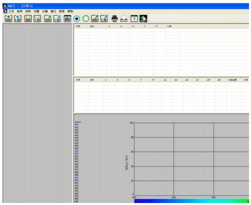 NS808的交通路標(biāo)測(cè)試模塊主要是通過上位機(jī)軟件SQCT配合NS808儀器實(shí)現(xiàn)的。使用前需先安裝好SQCT上位機(jī)軟件,再連接NS808儀器,然后打開上位機(jī)軟件,默認(rèn)為普通測(cè)試界面,如圖1所示,在該界面下可以完成CIE L*a*b、XYZ、ΔE*ab、ΔE*cmc、ΔE*00等色度數(shù)據(jù)的測(cè)試,詳細(xì)菜單和工具欄的介紹請(qǐng)參照該軟件自帶“色彩管理控制軟件使用說明書”,這里重點(diǎn)介紹交通路標(biāo)測(cè)試模塊。