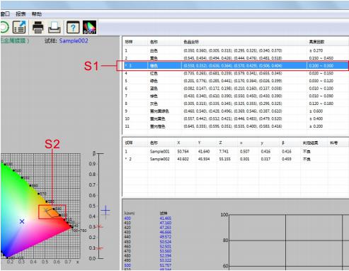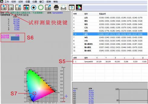 將測(cè)試樣品放在NS808測(cè)量口徑上,貼緊,鼠標(biāo)點(diǎn)擊試樣測(cè)試快捷工具,如圖13所示。大約1.5秒時(shí)間,完成測(cè)試,測(cè)試數(shù)據(jù)如圖13中S5所示,在色品坐圖中的位置如S7所示,仿真及判定結(jié)果如S6部分所示。