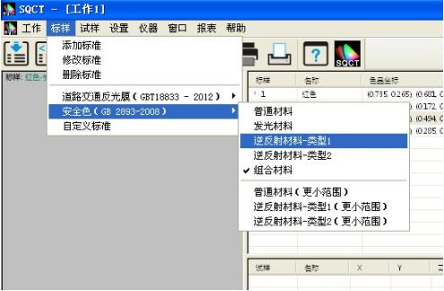 針對(duì)國(guó)內(nèi)交通路標(biāo)使用較多的標(biāo)準(zhǔn)GB2893,SQCT軟件將該標(biāo)準(zhǔn)中的標(biāo)準(zhǔn)色域納入其中,客戶只需根據(jù)自己需要進(jìn)行選擇即可,方法同菜單“道路交通反光膜GB/T18833”。