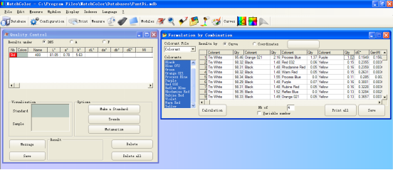 首先選擇正確的色料數(shù)據(jù)庫,然后點擊計算按鈕。這時軟件就會自動地對色料數(shù)據(jù)庫中的色料進行組合,計算出各種可能的配方,然后把更好的20個配方按照色差由小到大的順序顯示出來。