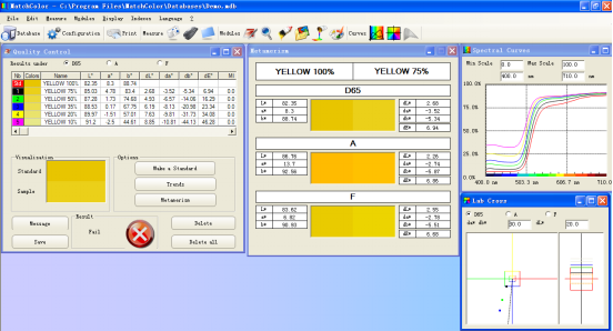 各種顏色表示方式:數(shù)據(jù)、反射率曲線、色差圖、統(tǒng)計趨勢圖、顏色色塊等。