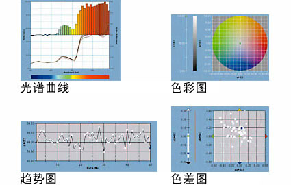 圖表顯示 | 光譜反射比(能見度)及其色差,K/S及其色差,吸收率及其色差,L*a*b*絕對(duì)值,L*a*b*(2D/3D色差分布,MI),xy色度圖,每個(gè)色空間的趨勢(shì)圖和柱狀圖以及色差方程式 |