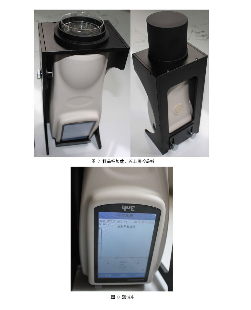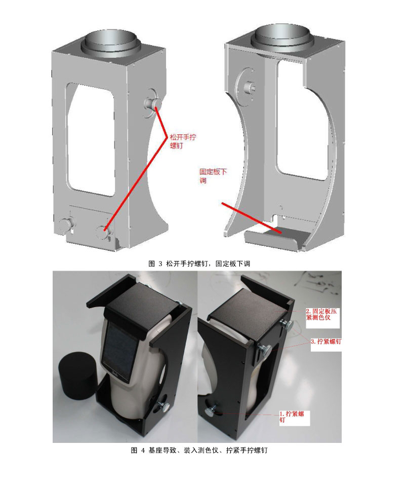 注意:確保測(cè)色儀固定穩(wěn)固,確保測(cè)色儀測(cè)量口徑一側(cè)的臺(tái)階面緊貼黑腔底板的底面。