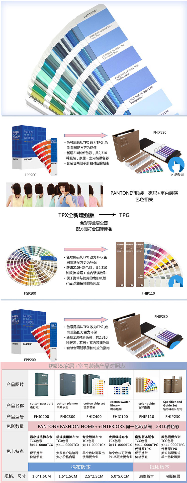 原TPX色彩指南升級為新的名稱TPG色彩指南(但仍保持與原有TPX后綴版相同的色彩完整性),在原來2,100種顏色基礎(chǔ)上,2016年3月新增210種新色彩,全套2,310種顏色,迄今顏色更多全的產(chǎn)品,本套裝包含兩本書形可撕色票,單頁便于取出,顏色也可供撕出達(dá)六次之多,另包含一本便攜式色彩南,扇形版本,方便于查色及外帶,應(yīng)用于:服裝,紡織,家居,室內(nèi)外裝潢,使用行業(yè)多,是一款值得推薦的產(chǎn)品.