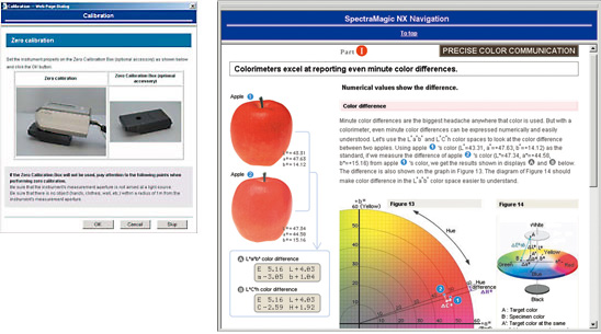 通過附加的導(dǎo)航功能,您可以采用在線逐步指示(包括圖解)完全控制整個操作流程。 此種獨特的特性可由用戶按照需要進行自定義。 SpectraMagic NX導(dǎo)航窗口同樣包括HTML版本“精確的色彩交流”的鏈接,其中包含的圖示和說明使得用戶對于色彩和色彩測量技術(shù)相關(guān)的基礎(chǔ)知識和技術(shù)項目有了更加清晰的了解。