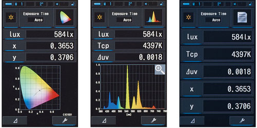 | 色彩顯示模式 | 相關(guān)色溫Tcp、與黑體Δuv的差異、XYZ、xy、u'v'、特征波長λd、色純度Pe、光譜輻射照度、EV、CRI(Ra、Ri)、峰值波長λp、曝光值 |