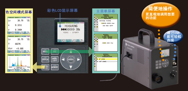 儀器配合可選的近攝鏡一起使用,可以測(cè)量的小面積為Φ0.1mm,不僅可以測(cè)量常規(guī)尺寸的顯示設(shè)備,也可以測(cè)量一些小面積的光源。